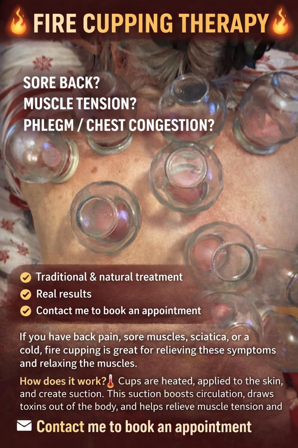 Fire cupping therapy is a traditional treatment where heated glass cups are placed on the skin to create suction, helping relieve muscle tension, improve circulation, and promote relaxation.